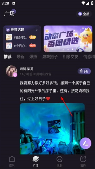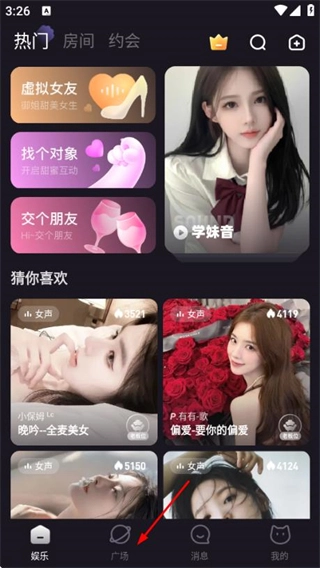 在娱乐页面点击底部的广场选项,进入广场页面。