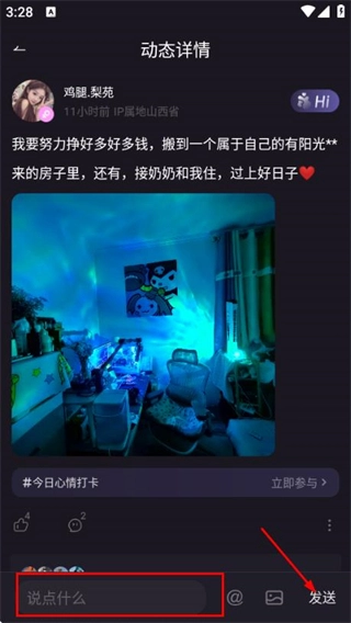 在动态详情页的输入框中填写评论内容,接着点击发送按钮,即可完成对该动态的评论操作。