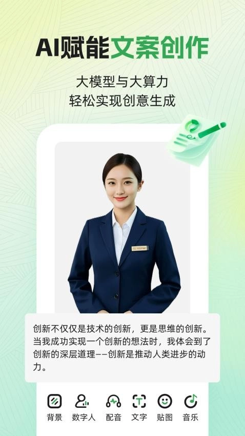 AI数字分身可为用户打造高度逼真的专属数字人,用户能借助模板快速生成个性化形象。平台不仅提供精细的数字人外观,还配备多种音色供选择,助力视频制作更精准。用户无需手动编辑视频,一键即可生成完整口播内容,软件还支持文案自动创作,全方位提升使用便捷性。