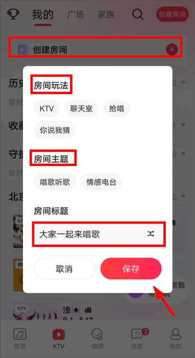 在KTV页面,点击顶部的“创建房间”,挑选房间的玩法与主题,填写房间标题后,点击“保存”按钮。
