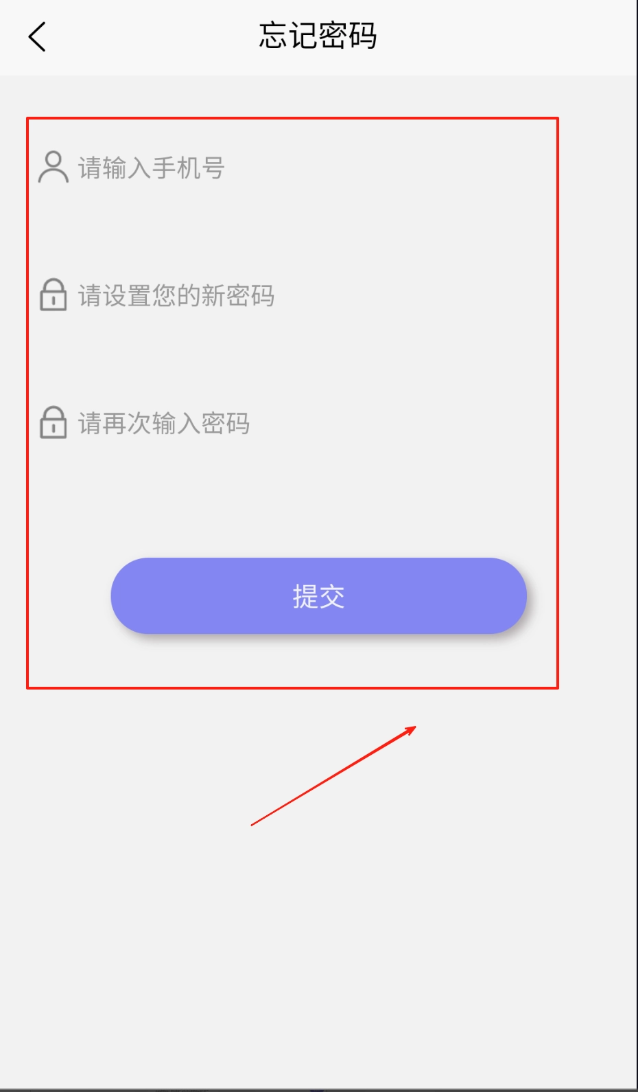 忘记密码时,可点击登录页面的相关提示,输入绑定的手机号码,在两次设置好新密码后,点击紫色的提交按钮,即可完成密码重置。