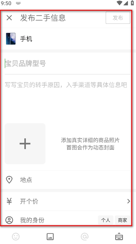 先填写宝贝的品牌型号,说明转手原因,上传真实且详细的商品照片,选定所在地点,设定价格,选择自己的身份,最后点击发布按钮就完成了。
