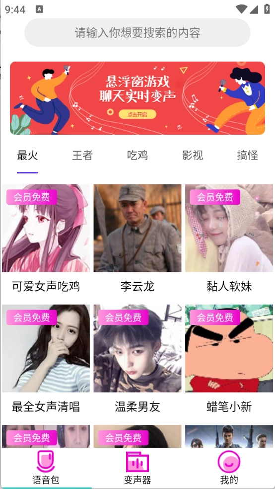 进入首页后,这里汇集了各式各样的语音包,涵盖了当下热门、王者、吃鸡、搞怪等多种类型。