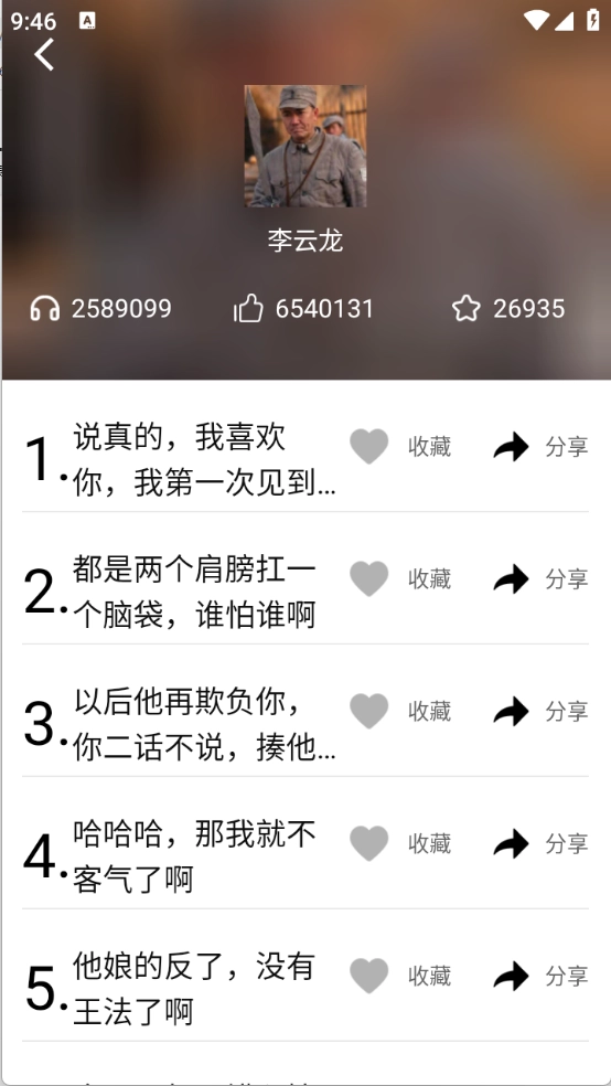 点开喜欢的语音包,可以播放、收藏以及分享等。