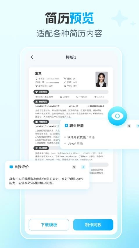 制作简历无需复杂操作,简单几步就能搞定。输入你的关键信息,挑选喜欢的模板,点击生成按钮,一份精心设计的简历立刻就出来了。就算你对设计和排版完全不懂,也能轻松做出让人眼前一亮的简历。