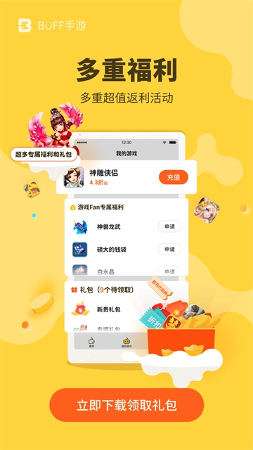 BUFF,也叫游戏fan,是一款专业的低价折扣客户端,汇聚了一线大厂的热门游戏,整合了九游、百度、360、联想、游戏FAN等多家国内知名平台的全部游戏资源,切实为用户提供海量精选游戏,并且通过货比三家的方式,推荐最优质、最稳定、最实惠的平台。它最大的特色在于支持自由比价,帮用户挑选最低价格;保障安全稳定,支持永久续充;新用户上线就能领取海量福利,还有独家礼包助力游戏体验;更有大额代金券补贴,只要你来就送!小编还为大家准备了申请游戏fan充值折扣的教程,有需要的朋友可以了解一下!