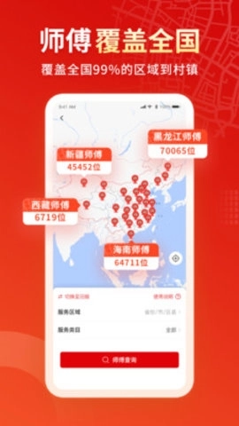 全国服务覆盖无死角:平台汇聚超180万专业师傅,服务网络遍及600座城市、3000个区县与40000个乡镇,无论何时何地,都能为您及时提供服务。