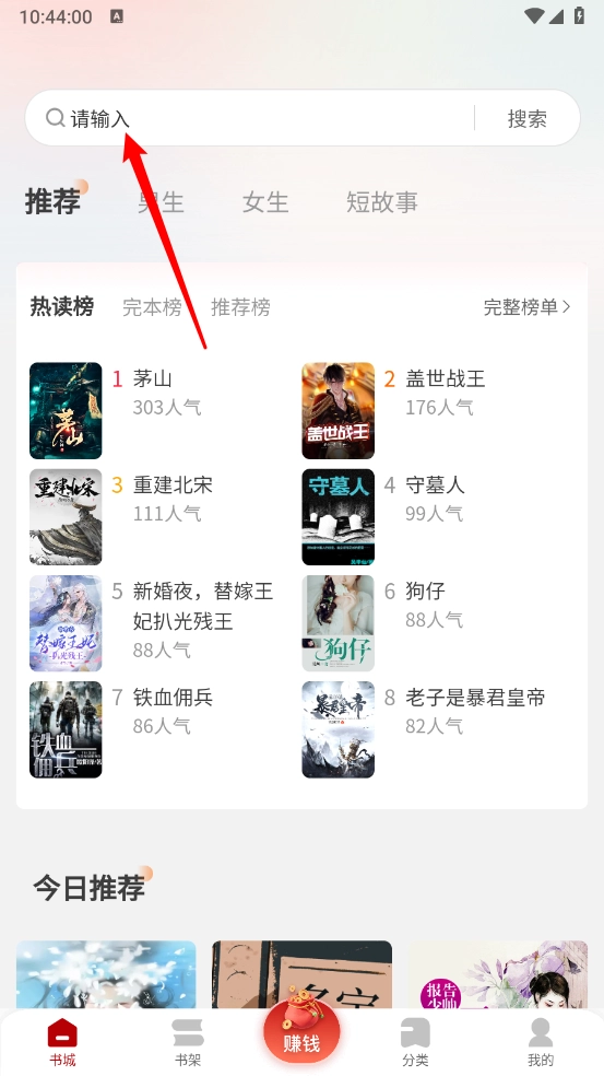 进入书城,点击上方的搜索框。