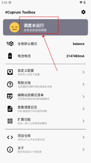 打开App后,首页顶部有个醒目的调度状态栏,点击这个区域就能激活CuprumTurbo调度服务。