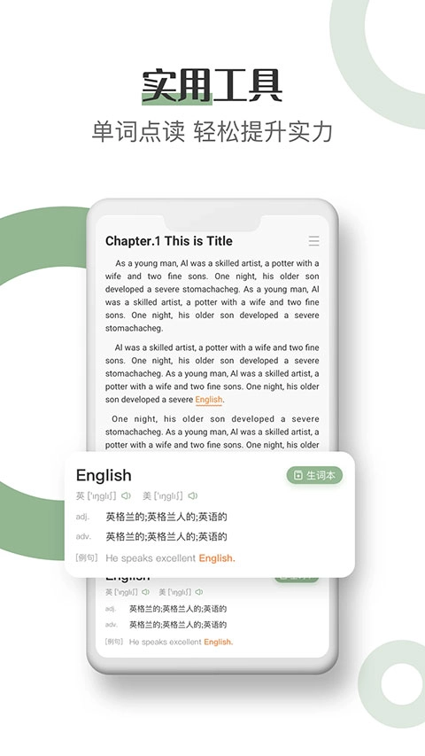 软件具备查词翻译功能,用户只需点击生词就能完成翻译;此外还设有单词本功能,便于用户复习巩固已学单词,助力词汇量提升。