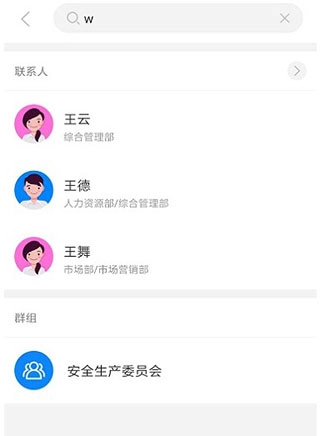 消息列表顶部的搜索栏支持搜索最近联系人里的人员、群组和讨论组,点击搜索结果就能直接进入消息收发界面。