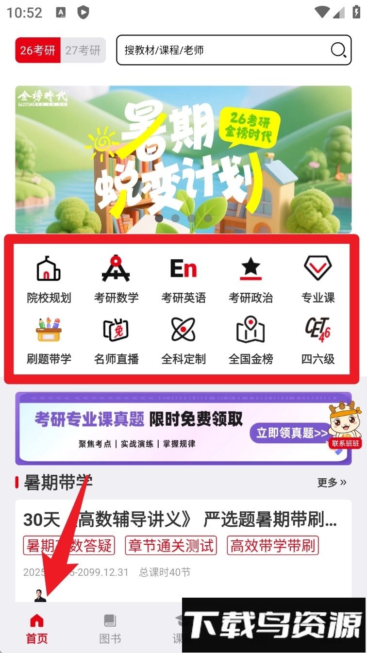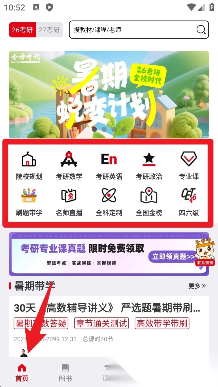 打开金榜时代考研App的首页后,点击“考研数学”“刷题带学”这类图标,就能迅速进入对应的学科内容页面。