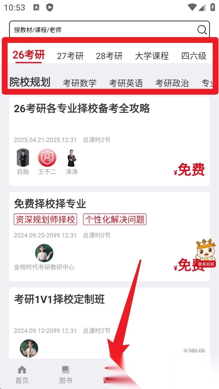 切换到“课程”标签页后,能够按照年份和科目对课程内容进行筛选,还可以查看推荐课程以及选校指导班。
