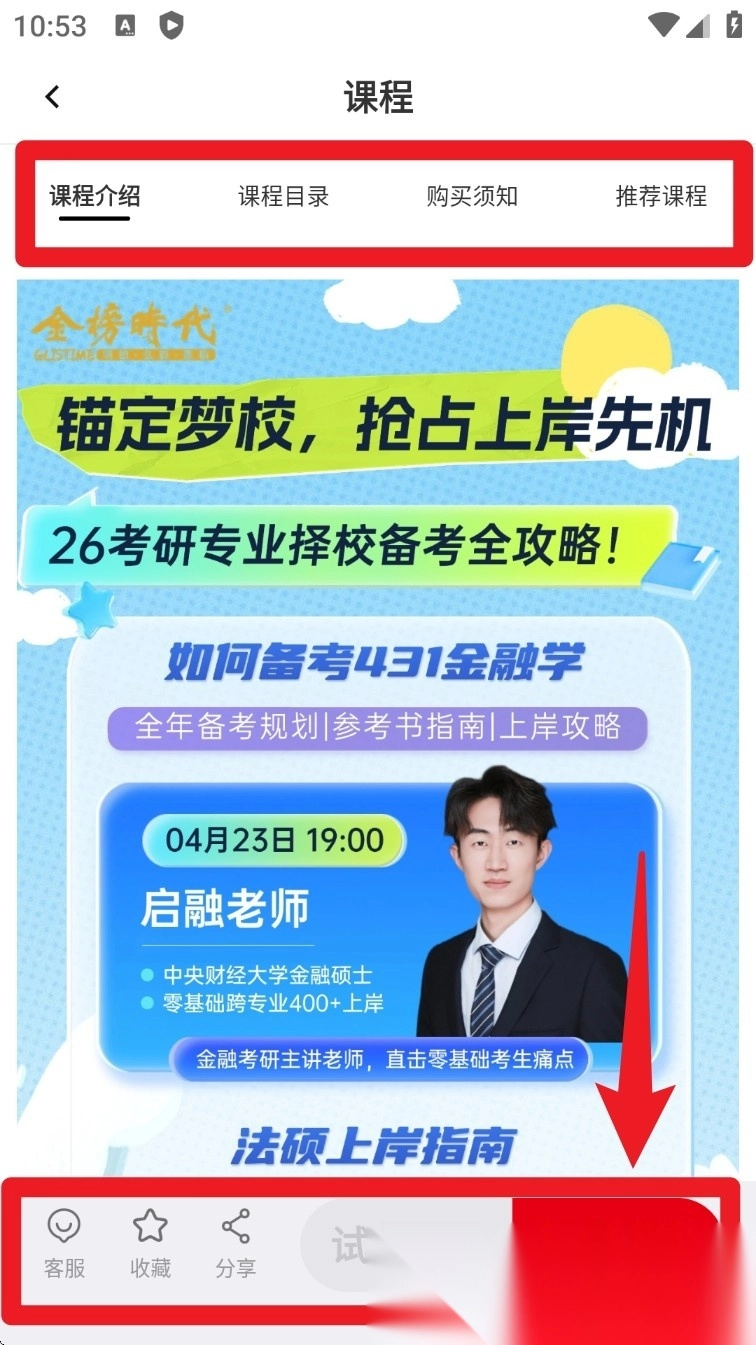 在课程详情页点击“立即领取”按钮,就能参与免费试听或报名,还支持分享和收藏功能。