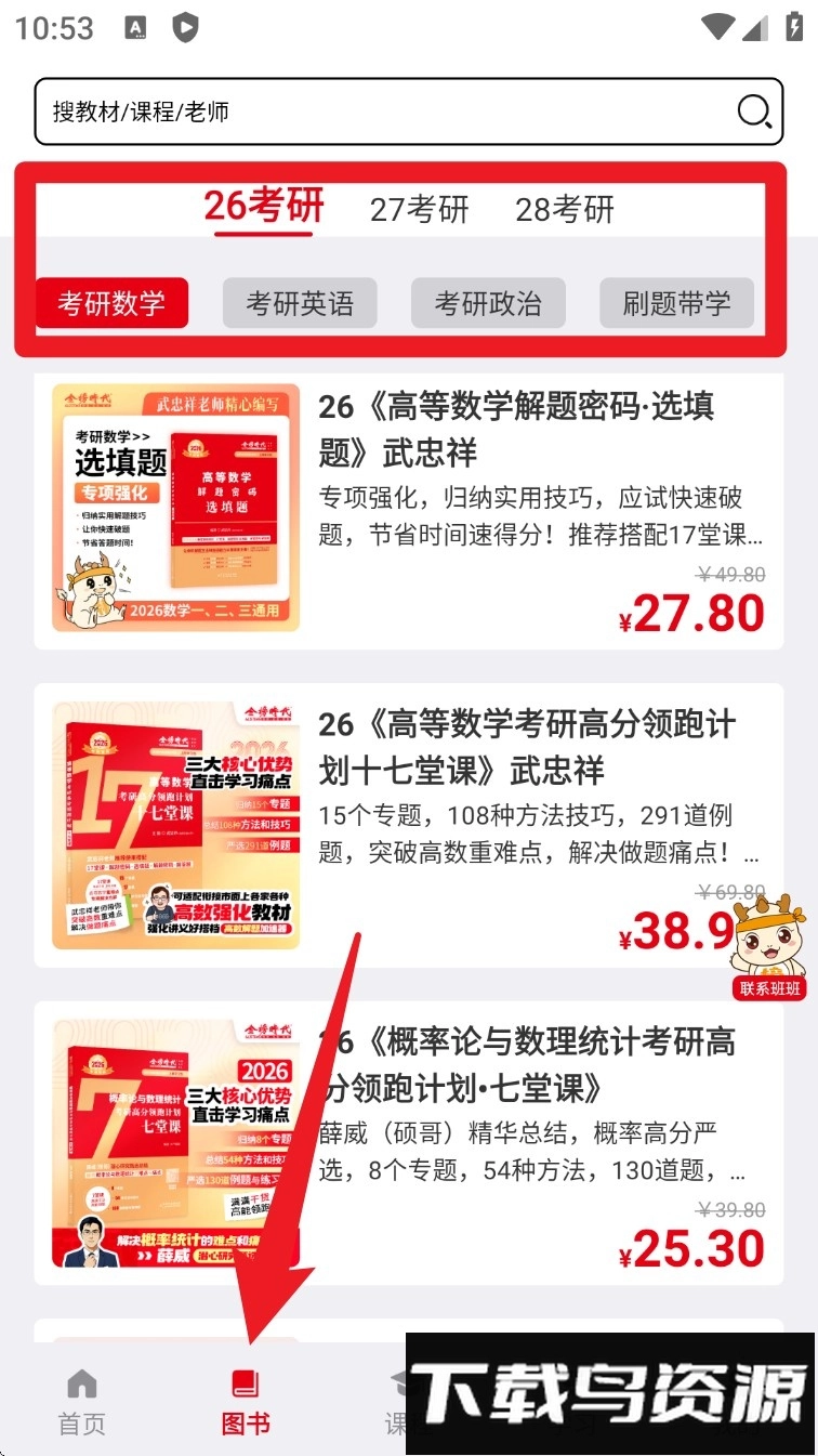 点击底部菜单的“图书”按钮,就能浏览各备考阶段的书籍,还能进行分类筛选和查看价格。