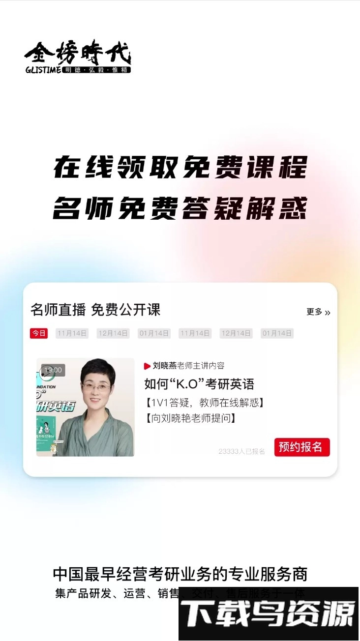 金榜时代考研是一款专注于考研、四六级及大学期末考试备考的学习软件,旨在为用户提供一站式的备考支持。平台整合了院校规划咨询、公共课与专业课的名师直播课程、优质录播内容以及配套的学习资料,全方位满足不同学生的多样化学习需求。这里汇聚了李永乐、王式安、武忠祥、宋浩等数学领域的知名教师,刘晓艳等英语教学名师,还有米鹏、张华堂等政治学科的资深老师,全程陪伴并助力学生达成升学的目标。
