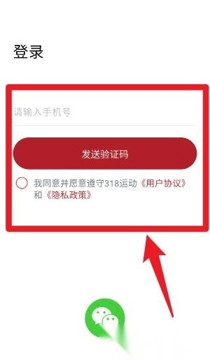 用户打开318运动后,需要先输入手机号,勾选相关协议条款,完成短信验证步骤,之后就能使用平台的各项功能了。