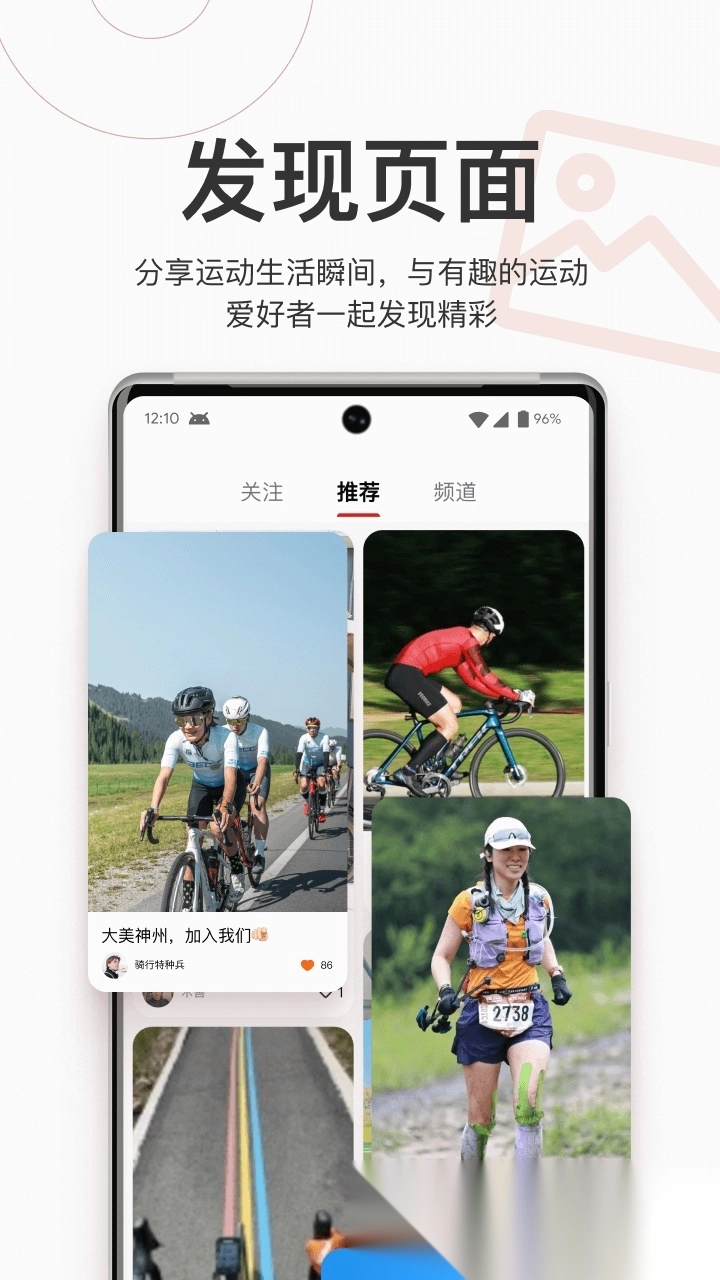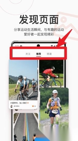 在发现页面,你可以浏览骑行、滑雪等爱好者发布的动态,还能通过关注、推荐、频道等方式切换内容。