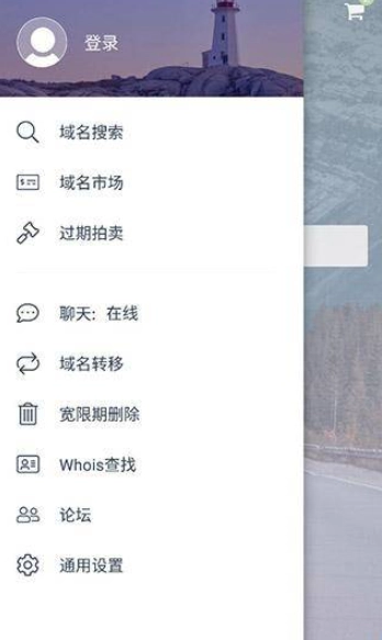回到主界面后,点击左上角的三条横线图标,就能看到域名市场、过期拍卖、聊天、域名转移、宽限期删除等相关功能选项。