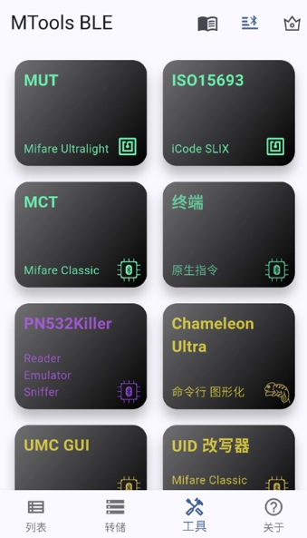 MTools BLE是一款专业度很高的NFC读写工具,能为用户提供读卡、改卡、写卡等实用功能。该软件兼容多种NFC标签,包括Mifare Classic 1K、Mifare Classic 4K、Mifare Ultralight、Mifare Ultralight C等,适配性出色。此外,MTools BLE还支持通过蓝牙连接外部读卡器进行读写操作,使用起来十分便捷!