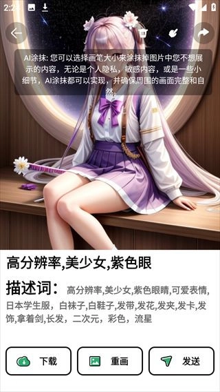 在修饰词输入框中填写你希望创作的画作所对应的形容词,建议描述得更具体些。举个例子,你可以输入:高分辨率、美少女、紫色眼眸、可爱神情、日式学生制服、白色袜子、白色鞋子、发带、发花、发夹、发卡、发饰、手持长剑、长发、二次元风格、色彩丰富、流星。
