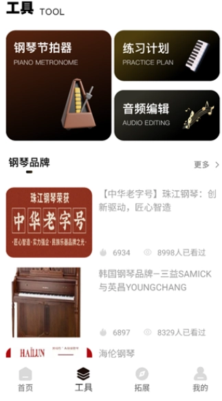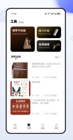 点击页面下方的“工具”选项,就能看到钢琴节拍器、练习计划、音频编辑等功能。