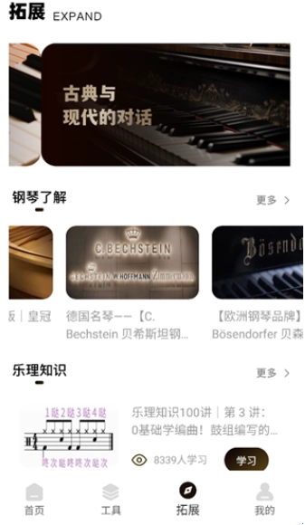 点击页面下方的“拓展”按钮,就能查看钢琴介绍、乐理知识等内容。