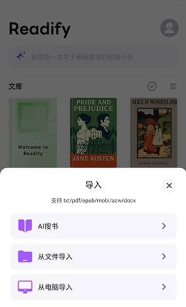 软件提供三种使用方式,分别是AI搜书、从文件导入和从电脑导入。
