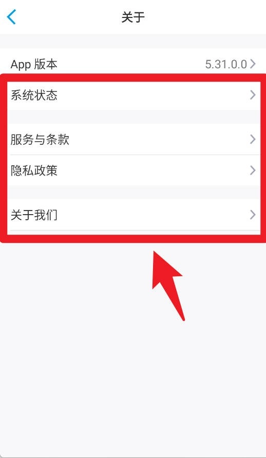 在关于页面中,您能够查看系统状态、服务条款、隐私政策以及关于我们等相关信息。