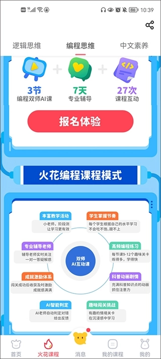 火花思维课程的覆盖范围十分广泛,在软件首页,除了火花直播课堂之外,还设有时间规划、中文素养、逻辑思维、编程素养等学习课程,助力孩子们在学习中快速进步、不断成长。