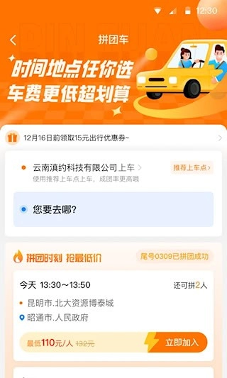 支持拼团下单,用户可以便捷地加入团购订单,和其他人一起拼车,从而减少出行的费用。