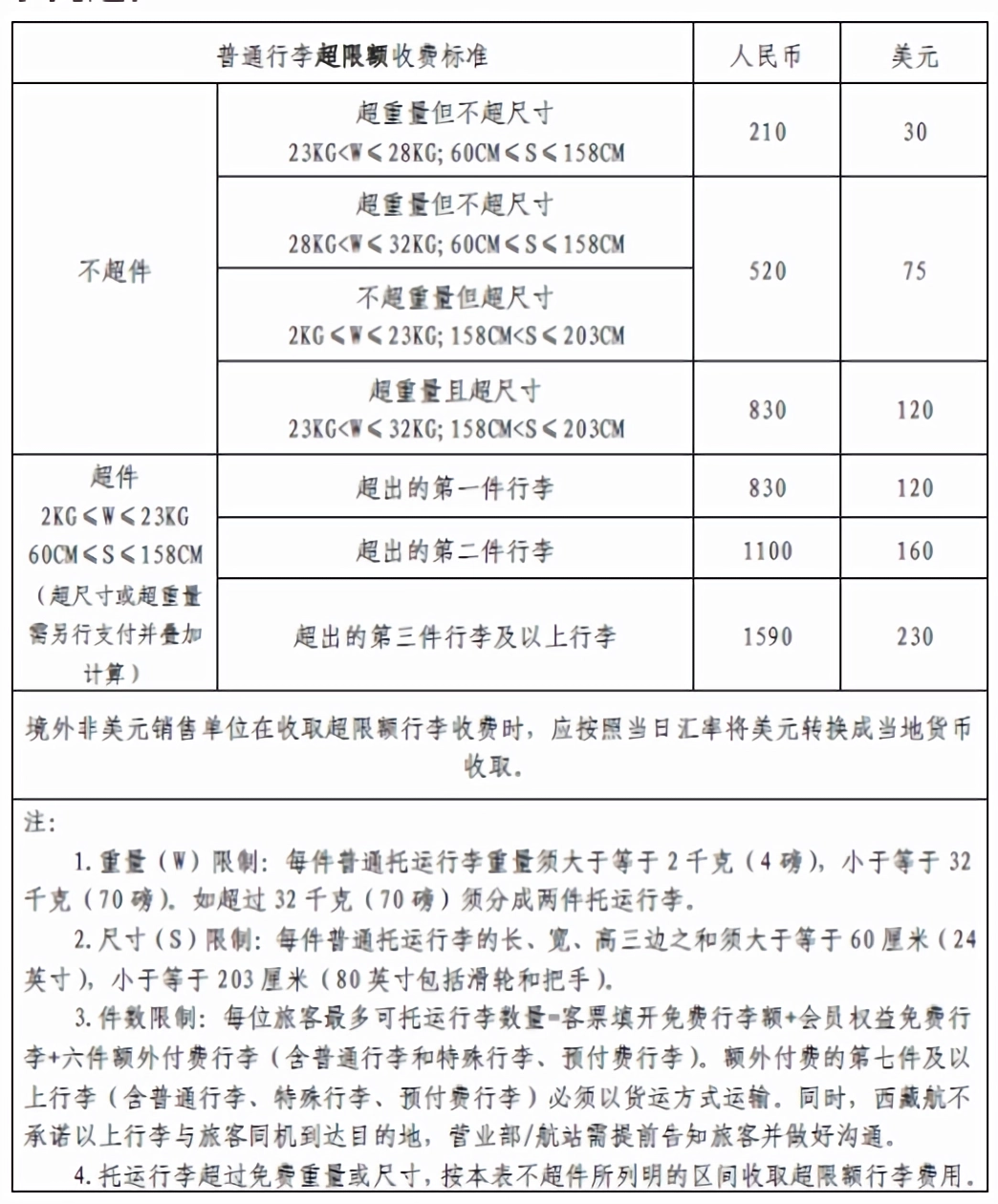 西藏航空行李超重收费标准