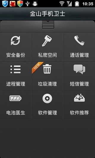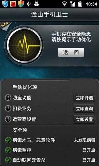 净化系统:金山杀毒手机卫士不仅具备查杀病毒的功能,还能对手机展开全方位优化。它可自动调节设备频率,关闭非必要的后台运行程序,以此降低电量消耗;同时,该功能还能清理手机中的垃圾文件与缓存数据,释放被占用的内存空间,从而确保手机始终保持流畅的运行状态。