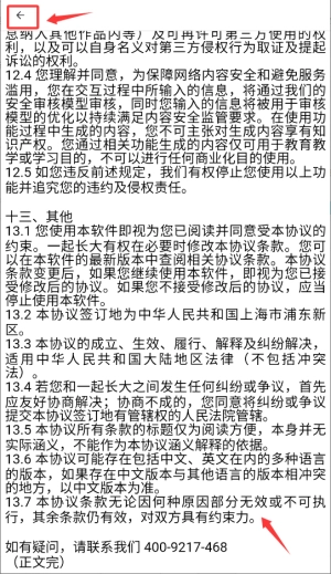 从功能介绍页面进入后,阅读用户协议与隐私条款,阅读完成后点击左上角的返回箭头(←)退出该页面,即可进行登录操作。