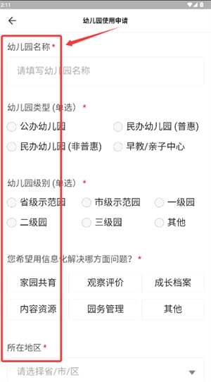 在填写幼儿园申请时,先录入各项基本信息,确认无误后提交,即可完成申请流程。