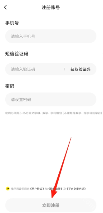 填写手机号以及密码,点击立即注册