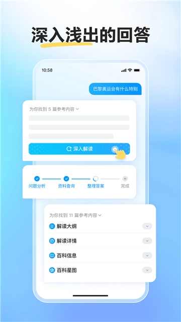 怎么问都可以:当你碰到问题,只要你有需求,即刻获得为您定制的回答。搜地图导航,搜休闲音乐,搜高清图片,搜专业百科,搜表格导图,什么都能搜!提问不设限,问文档,问图片,问对话,怎么问都可以!