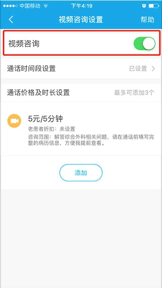 点击“通话价格及时长设置”选项,再点击“添加”按钮,在这个界面中,你可以对每次视频咨询的价格、相关优惠活动,还有自身的咨询范围与说明进行设置。