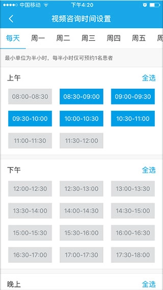 点击“通话时间段设置”,就能设定适合接听电话的时段,如此一来,患者就只能在你设置好的空闲时间里咨询健康相关的问题了。