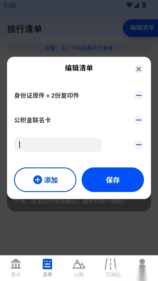 提供旅游所需的材料准备清单,用户可以例如需要准备身份证原件和复印件等,轻松生成个人出行清单,并可根据提醒来准备材料。