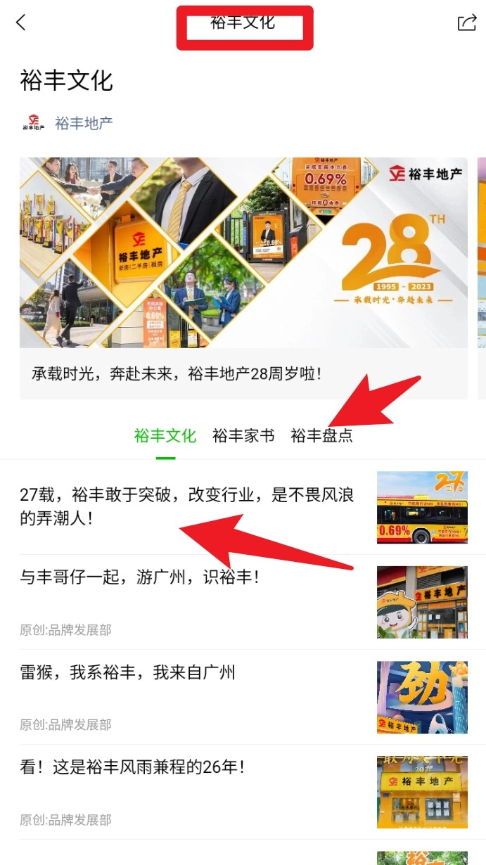 点击顶部的裕丰文化栏目,就能切换到品牌故事页面,进而了解企业的发展历程和最新的宣传活动信息。