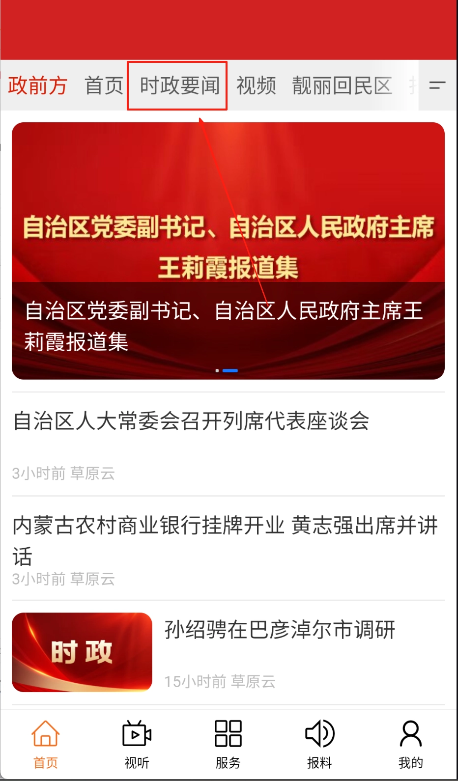 点击首页顶部导航栏的“时政要闻”,或者滑动页面找到“直播”频道,就能马上查看辖区内的最新政策和突发事件。