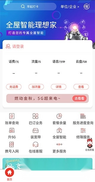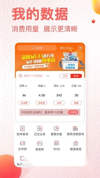 可提供实时精准的数据查询服务,涵盖话费余额、月度账单、流量使用详情、已办理业务、积分状态、通话及上网记录等信息;此外还支持宽带故障的申报以及处理进度的跟踪。