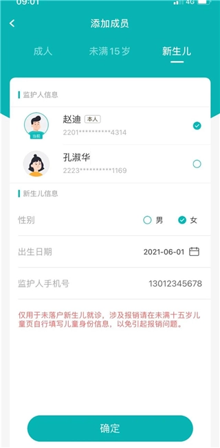 添加新生儿信息时,可通过选择监护人、新生儿性别、新生儿出生日期、监护人联系电话进行操作;待新生儿具备自身身份信息后,需携带其有效身份证件前往门诊窗口,变更院内档案中的身份证号与姓名,并按照“未满15岁”的方式重新添加信息。