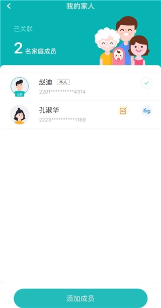 【我的家人】-【添加成员】可添加5个亲情账户,点击【切换身份】即可为家人办理挂号、预约、结算、查看报告等业务。