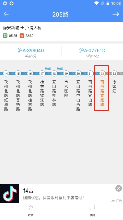 例如205路,能查看该线路公交车途经的站点和发车时间;要是常坐这路车,可点击下方的【收藏】按钮;点击【换向】就能查看从静安新城开往卢浦大桥方向的发车时间。
