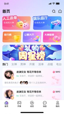 打开软件后,首页呈现出丰富的人工派单、各类排行榜以及多个热门房间。