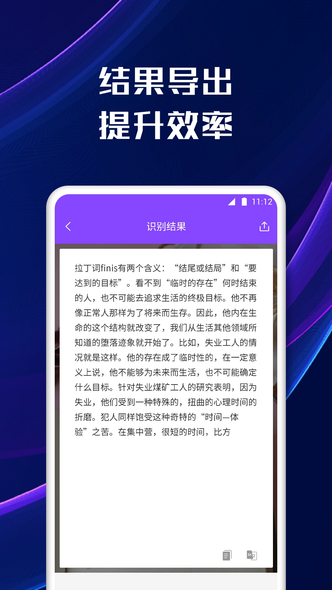 扫描完成后,点击“识别文字”按钮,就能把图片里的内容转换成可以编辑的文本,而且支持中文、英文、日文等多种语言。