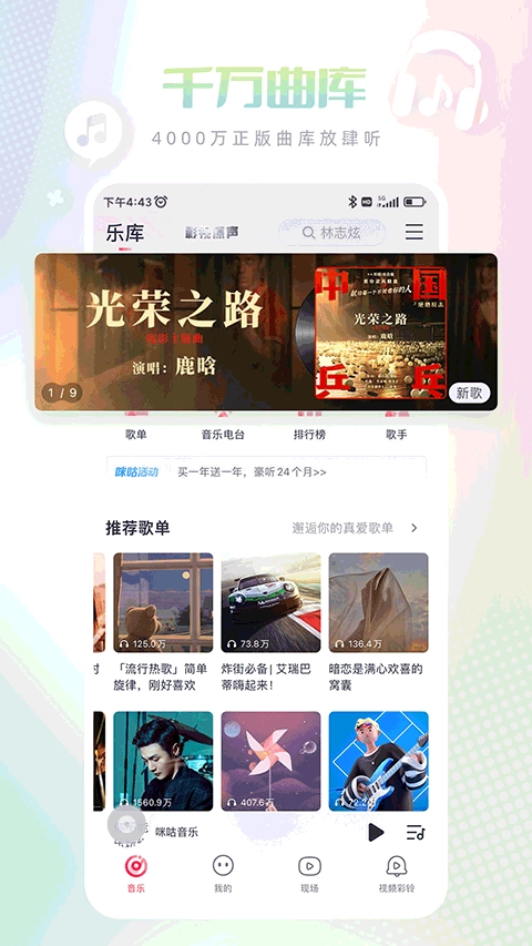 首先打开本站的咪咕音乐,接着进入主页,这里界面清晰直观,内容十分丰富,设有多个不同的板块,而且软件还会依据用户的音乐喜好为其推荐合适的歌单。