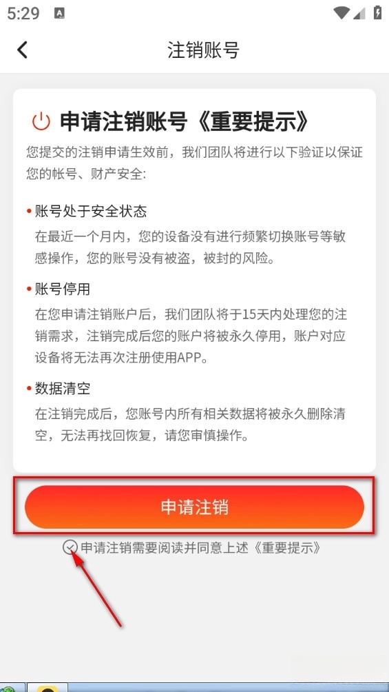 最后点击确认即可完成,15天未登录则注销成功